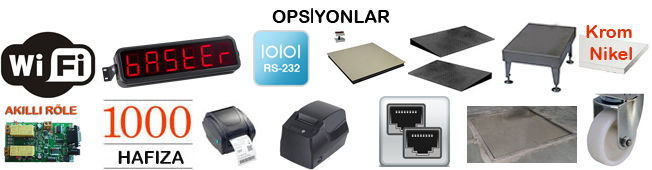 Isteğe bağlı ek seçenekler RS-232 bağlantısı Wifi Haberleşme Harici büyük gösterge Ethernet Bağlantısı Harici termal yazıcı Harici mini termal Akıllı röle Ayrık gösterge Tek veya çift taraflı rampa Zemine Gömme Tabana uygun sehpa Tekerlekli mobil taban Krom nikel kapak ve taban IP-68 Yük hücresi | |